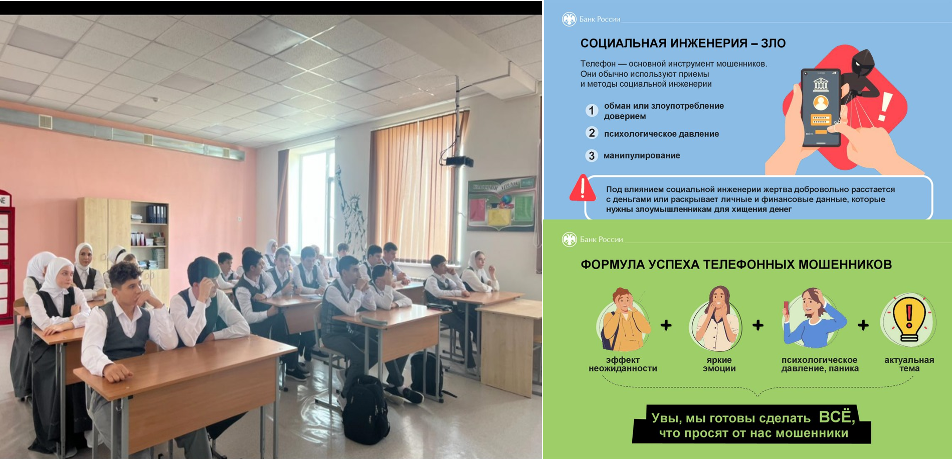 12.10.2024Центральный Банк России запустил проект против мошенников «Клади трубку», в котором МБОУ «СОШ № 2 с. Терское» приняло активное участие. 12 октября 2024г. зам. директора по УВР Хасуханова Л.С. провела профилактическую беседу в 9-11 классах, которая была направлена на повышение уровня осведомленности и киберграмотности. Чтобы научить детей распознавать телефонных мошенников, лектор рассказала о преступных схемах, раскрыла ключевые индикаторы, сигнализирующие о мошенничестве и необходимости прервать разговор.